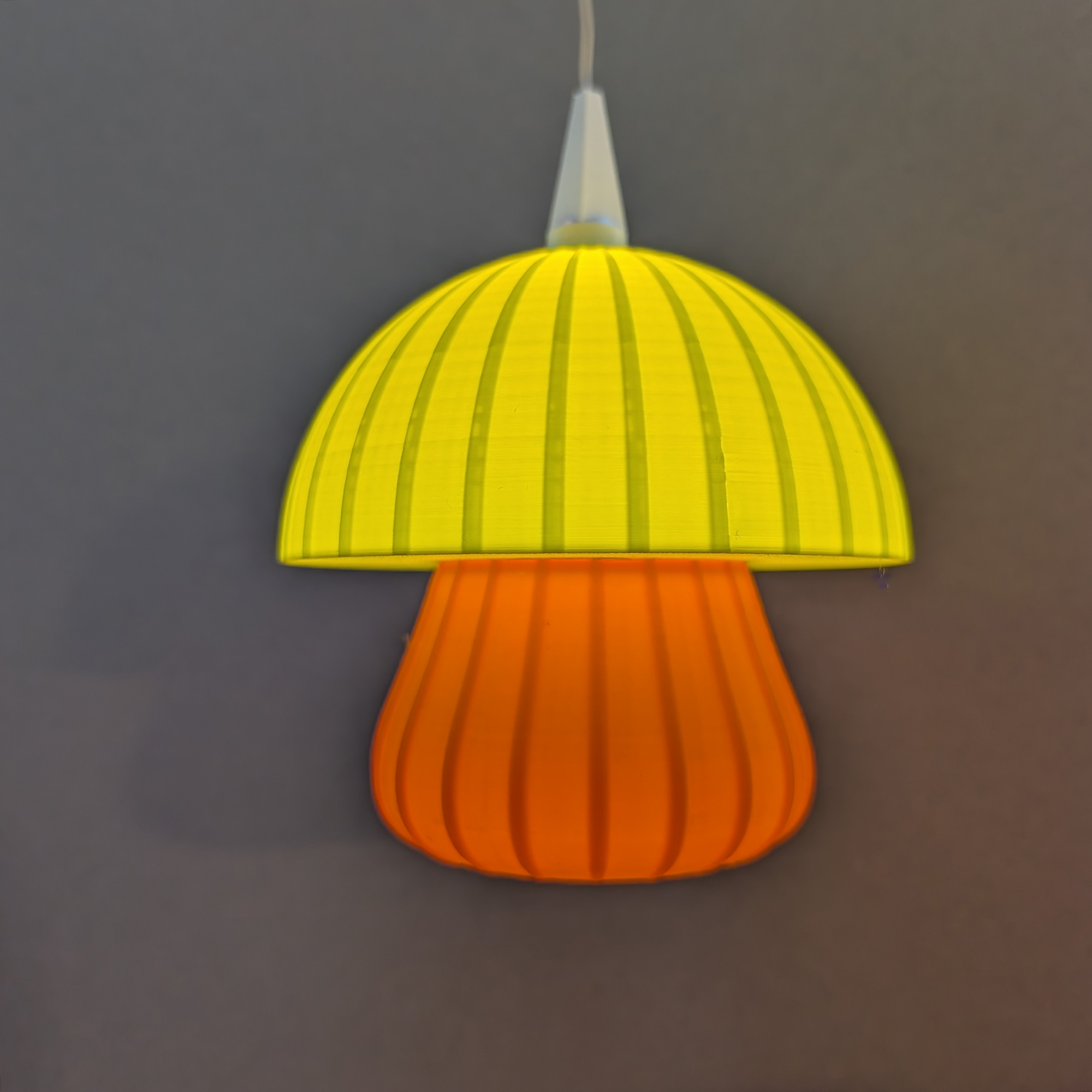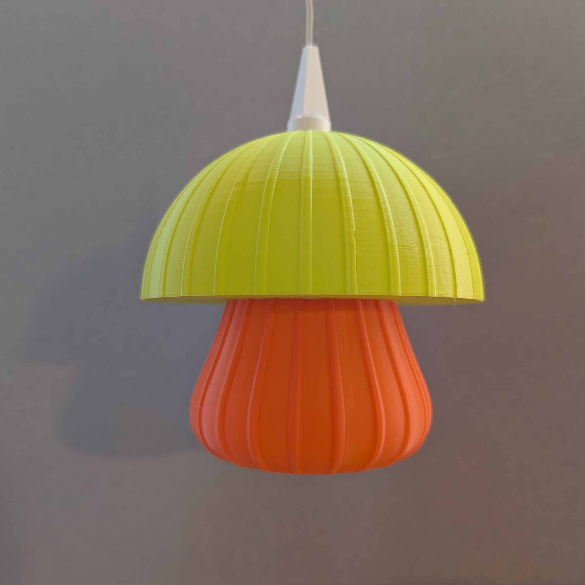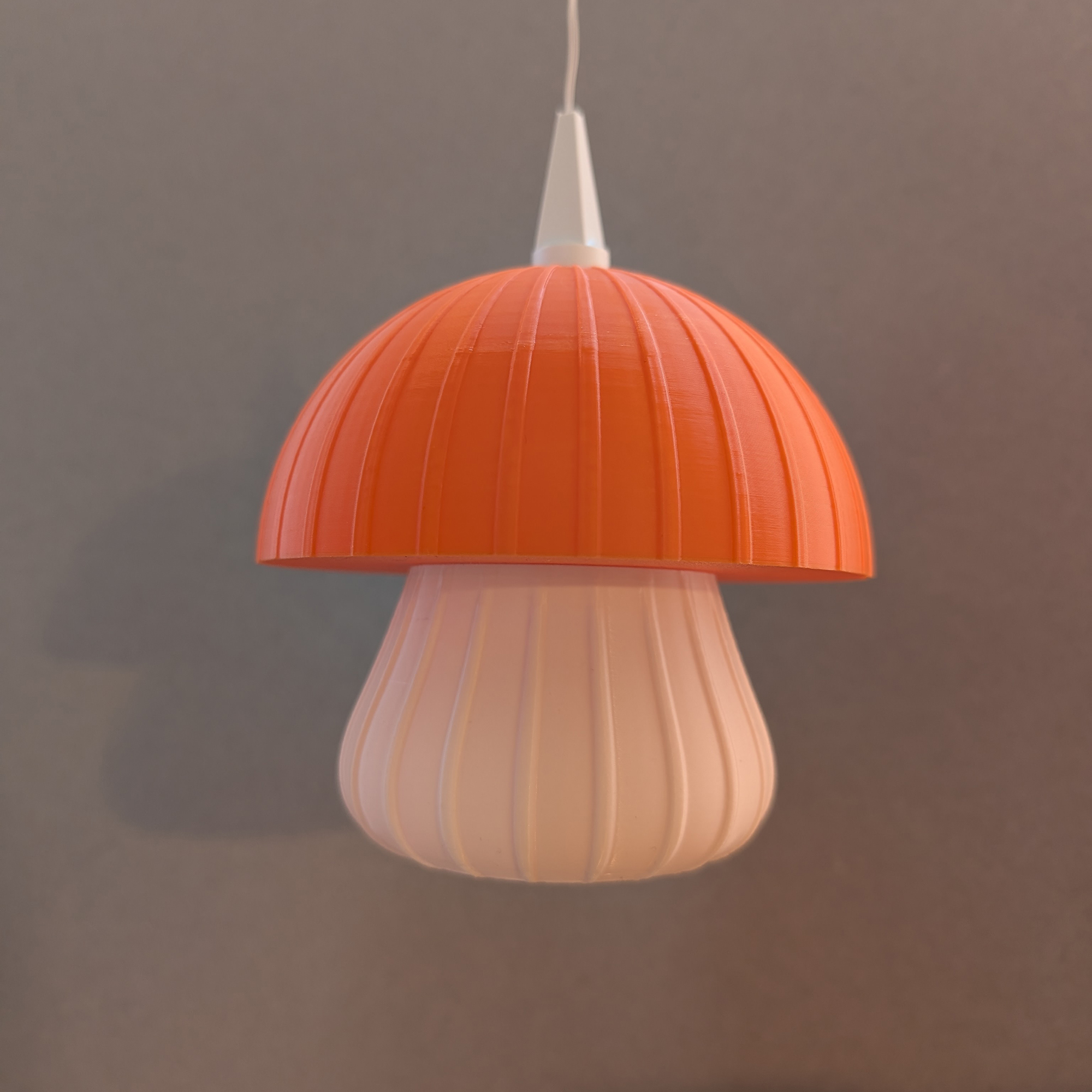 Die weich gerundete Form des Schirms trifft auf feine, vertikale Linien, die im eingeschalteten Zustand ein besonders stimmungsvolles Lichtspiel erzeugen. Der zweifarbige Aufbau lässt die Leuchte wie einen leuchtenden Pilz wirken – warm, modern und gleichzeitig verspielt, ohne kitschig zu sein.