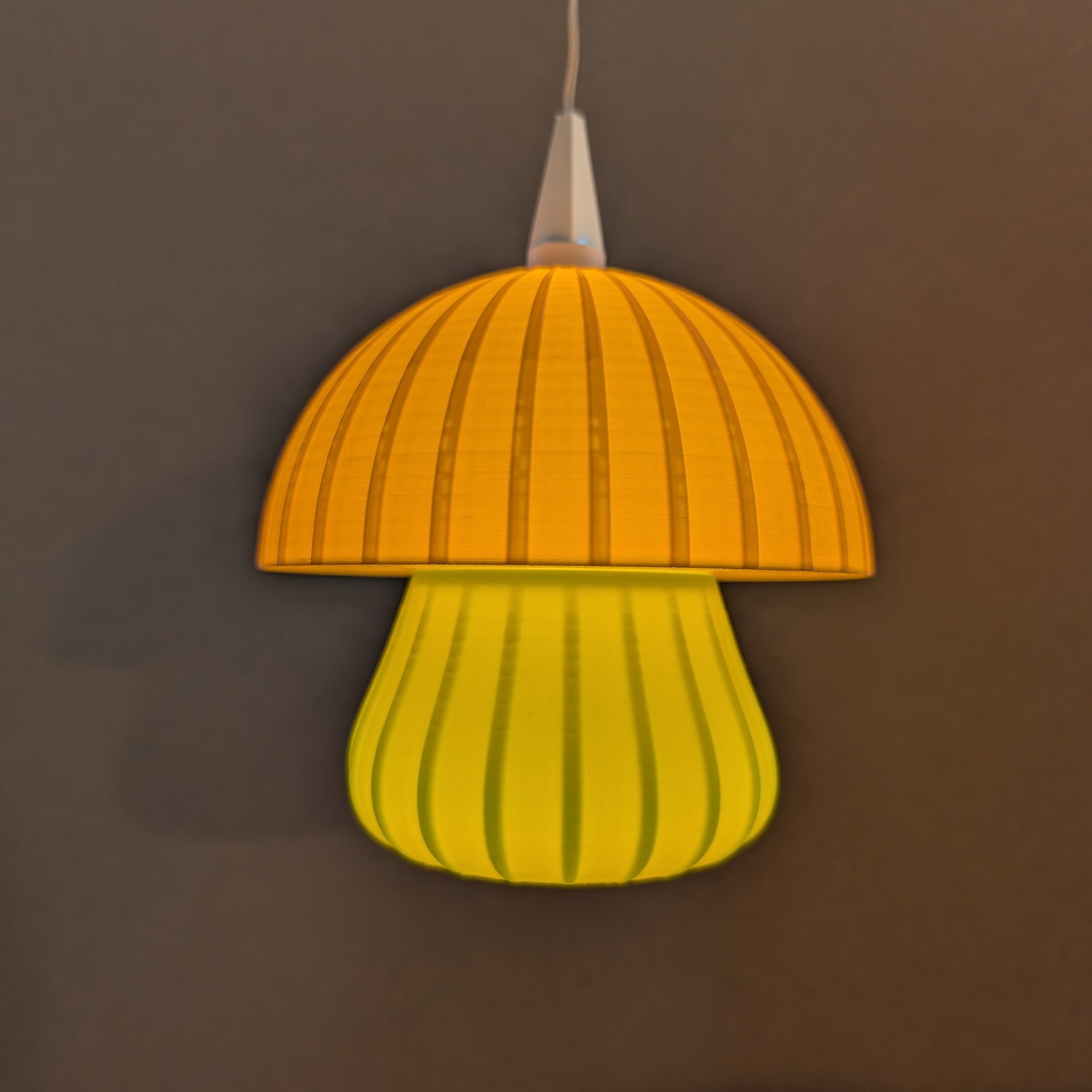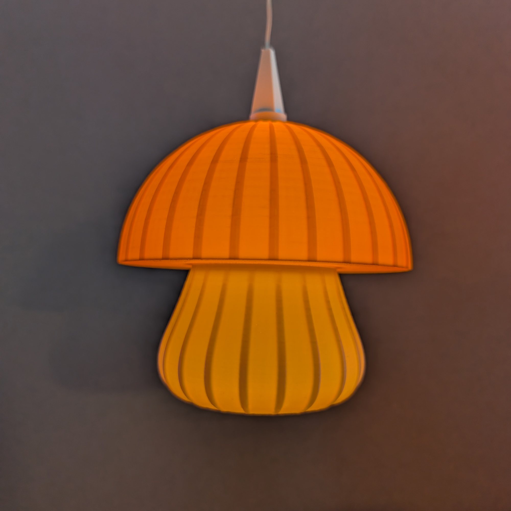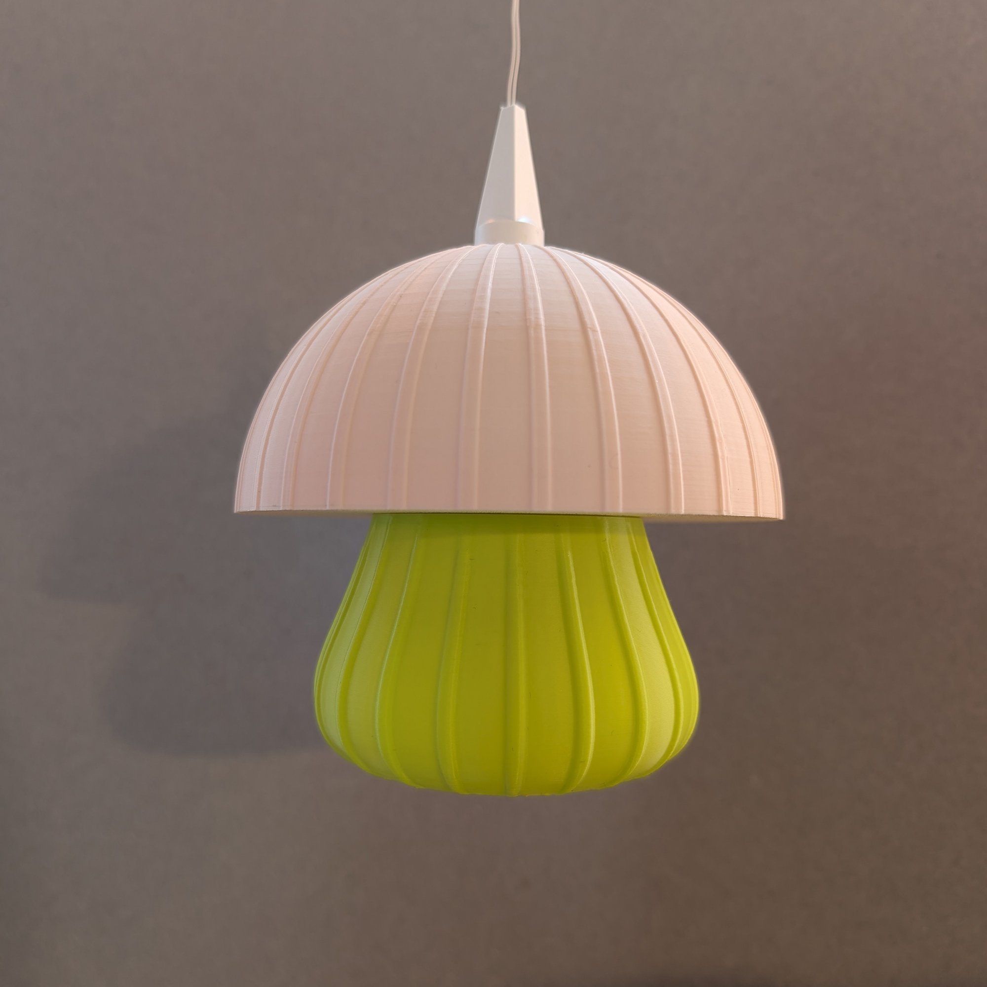 Die weich gerundete Form des Schirms trifft auf feine, vertikale Linien, die im eingeschalteten Zustand ein besonders stimmungsvolles Lichtspiel erzeugen. Der zweifarbige Aufbau lässt die Leuchte wie einen leuchtenden Pilz wirken – warm, modern und gleichzeitig verspielt, ohne kitschig zu sein.